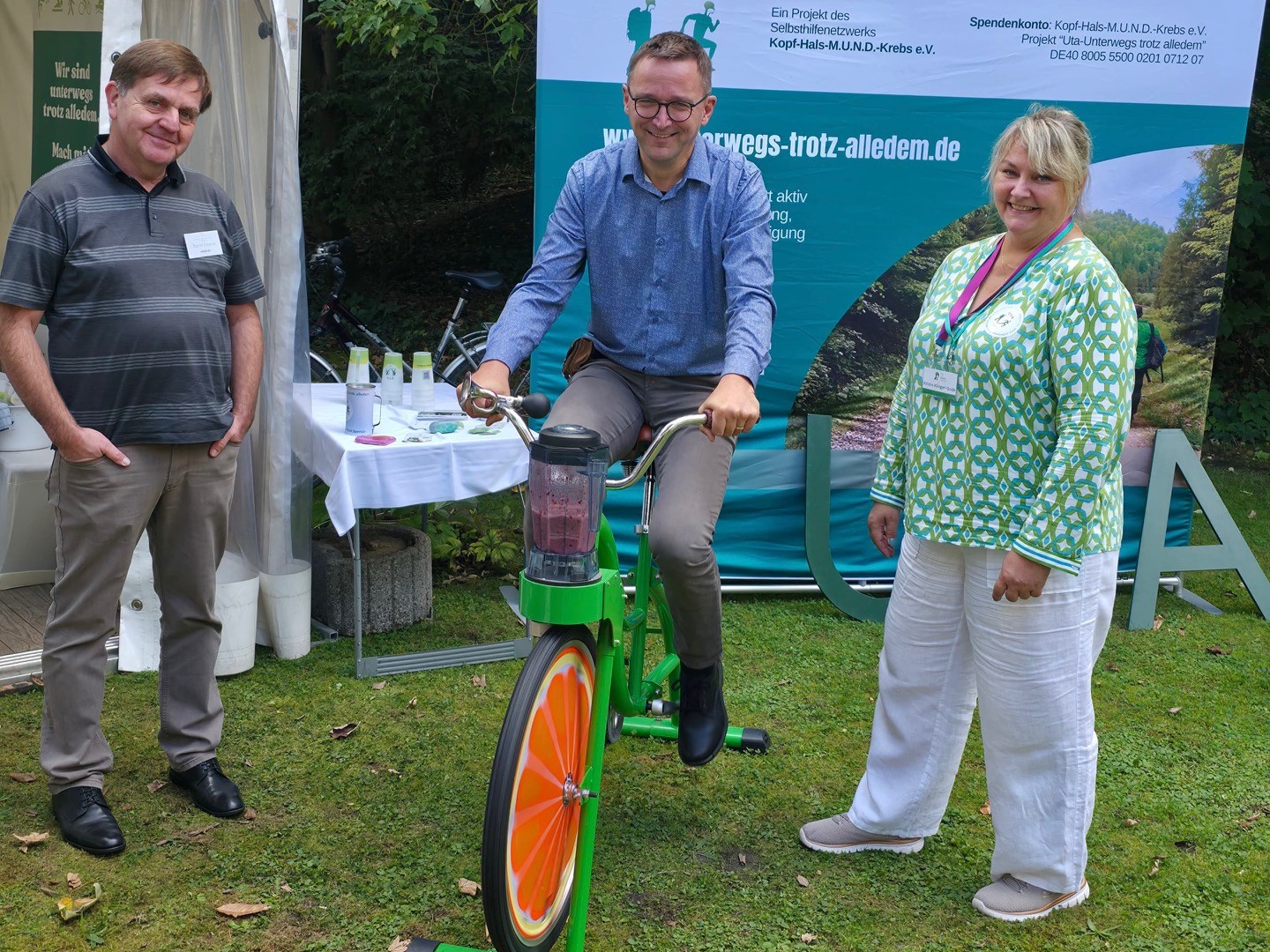 Neben den regionalen Selbsthilfegruppen präsentierte sich unser deutschlandweites Selbsthilfenetzwerk und lud mit einem besonderen Mitmachangebot zum Verweilen ein. Besucherinnen und Besucher konnten sich auf unserem Smoothie-Bike ihren ganz persönlichen Smoothie selbst erradeln – eine Aktion, die für Begeisterung sorgte und viel Aufmerksamkeit auf sich zog. Damit konnten wir perfekt auf unser Herzensprojekt Uta – unterwegs trotz alledem aufmerksam machen.